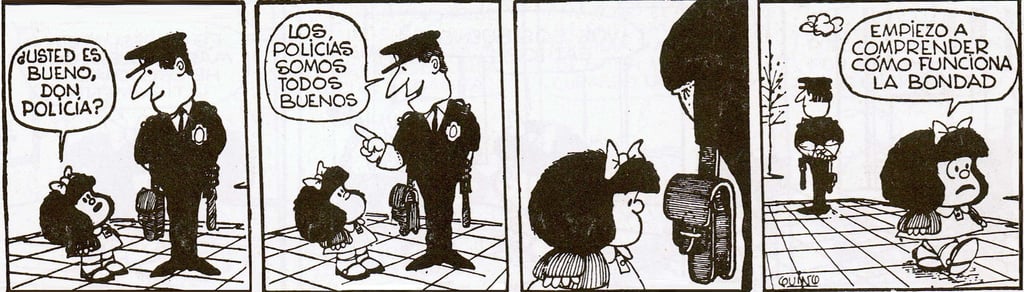 En otro ejemplo poderoso sobre la autoridad y la violencia, Mafalda le pregunta a un policía si él es "bueno". La respuesta del policía, "Los policías somos todos buenos", parece una afirmación inocente, pero cuando Mafalda observa el revólver del oficial y se aleja, reflexiona: "Empiezo a comprender cómo funciona la bondad". Esta viñeta es un comentario ácido sobre cómo la autoridad se ejerce a través de la violencia, y cómo muchas veces la "bondad" de las instituciones se basa en el uso de la fuerza para mantener el orden. Quino nos invita a preguntarnos: ¿es realmente "bueno" un sistema que depende de la violencia para funcionar? ¿Acaso el uso de la fuerza no despoja a la autoridad de su moralidad? Mafalda, con su inocencia y su agudeza, nos enfrenta a una pregunta incómoda sobre la legitimidad del poder.