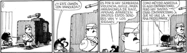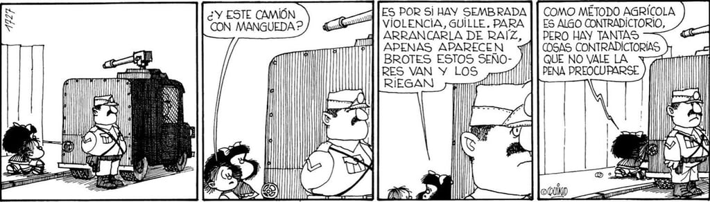 En una historieta que refleja una visión crítica de la política y la violencia en la sociedad, Mafalda le explica a Guille que el camión hidrante de la policía "es por si hay sembrada violencia, Guille. Para arrancarla de raíz, apenas aparecen brotes estos señores van y los riegan". Esta crítica a la violencia como un "método agrícola" muestra la contradicción inherente en los sistemas que intentan controlar y erradicar la violencia a través de la misma fuerza que la genera. Mafalda, con su sentido del absurdo, deja entrever una de las ironías más dolorosas: la violencia no se erradica con más violencia, sino que se perpetúa en un ciclo sin fin. En tiempos de represión y control social, esta crítica de Quino sigue siendo pertinente, recordándonos que el sistema no siempre tiene las respuestas que prometió.