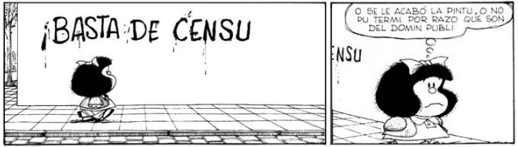 Quino también tocó el tema de la censura de manera ingeniosa. En una historieta, Mafalda se encuentra con un grafiti que dice "¡BASTA DE CENSU", un mensaje truncado que refleja la ironía del intento de censura. Mafalda, con su mirada crítica, se pregunta si el autor del mensaje "se le acabó la pintura o no pudo terminarlo por razones del dominio público". Esta escena, cargada de humor, revela cómo Quino usaba la ironía para señalar la falta de coherencia y la auto-censura presente en las sociedades que pretenden controlar lo que se puede decir y lo que no. En su crítica a la censura, Quino lograba señalar la contradicción de intentar controlar algo tan esencial como la libertad de expresión, mientras que la propia censura se vuelve tan absurdamente ineficaz que ni siquiera puede completarse correctamente.