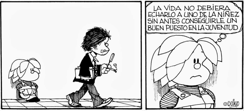Finalmente, una de las viñetas más significativas para mí es la que fue introducida a mi vida gracias a mi esposa Giselle, quien es una gran admiradora de Mafalda y de la obra de Quino. En esta historieta, Miguelito observa a un joven que, tras un largo día de trabajo, lleva en un brazo libros y papeles, mientras que con la otra mano sostiene un chupetín y un cigarro. Miguelito, reflexionando sobre el paso de la niñez a la adultez, se dice a sí mismo: "La vida no debiera echarlo a uno de la niñez sin antes conseguirle un buen puesto en la juventud." Esta reflexión de Miguelito es una crítica profunda a las expectativas sociales que, desde una edad temprana, nos lanzan al mundo adulto sin darnos las herramientas necesarias para enfrentar las demandas de la vida. En su simpleza, Quino muestra cómo el sistema social nos empuja a ser adultos responsables y productivos, sin antes habernos dado la oportunidad de comprender el mundo ni de disfrutar de nuestra juventud.