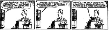 Una de las primeras historietas que quiero resaltar es aquella en la que el padre de Mafalda, sentado frente al televisor, escucha una noticia que habla sobre los precios del mercado internacional y las trabas aduaneras impuestas por otros países, las cuales, según la televisión, "ahogan nuestras exportaciones y deterioran nuestra economía". En el tercer recuadro, Mafalda, con su característico tono de indignación y crítica, reflexiona: "¡Qué mala pata! ¡Justo a nosotros viene a tocarnos un mundo lleno de países extranjeros!" Esta viñeta es una crítica directa a la injusticia del sistema económico global, que no solo afecta a los países en desarrollo, sino que los deja a merced de decisiones tomadas fuera de su control. A través de esa simple línea de Mafalda, Quino nos recordaba que las decisiones tomadas por otros países tienen un impacto directo y a veces devastador en nuestras economías locales.